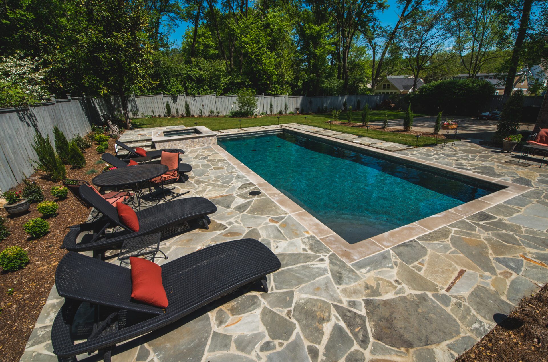 We combine the pool with the surrounding hardscape so the entire space looks intentional, high-end, and built for entertaining.